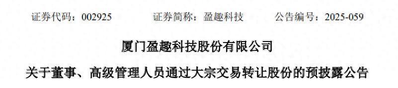 盈趣科技9日晚间的公告显示,公司董事、总裁杨明和财务总监、董事会秘书李金苗,计划在2025年7月2日至2025年10月1日期间,通过大宗交易转让合计不超91万股至双方配偶。